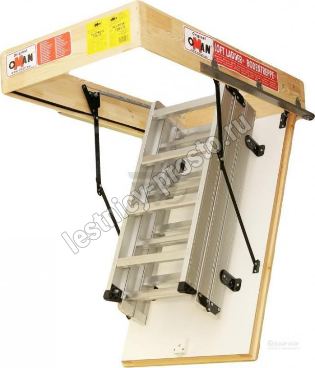 Складная 3-х секционная (до 2800 мм) или 4-х секционная (до 3500 мм) чердачная лестница. Рабочая поверхность полностью выполнена из алюминия. Термоизоляционная крышка типа "сэндвич" имеет усиленную теплозащиту, облицована с двух сторон ДВП белого цвета. По контуру короба имеется уплотнитель;