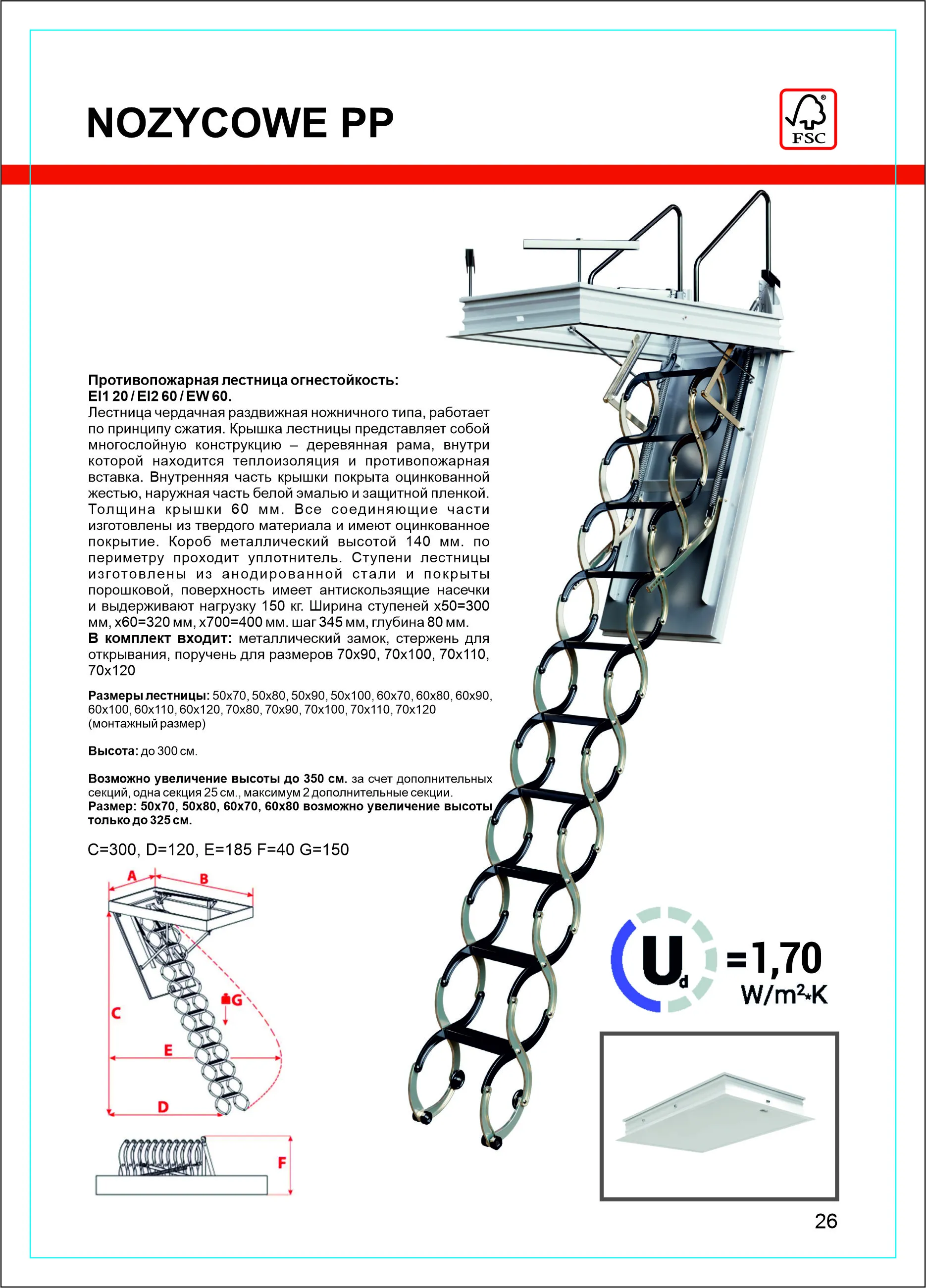 Сертифицированная, противопожарная лестница, огнестойкость: EI1 20 / EI2 60 / EW 60. Лестница чердачная, раздвижная, ножничного типа, работает по принципу сжатия. Крышка лестницы представляет собой многослойную конструкцию – деревянная рама, внутри которой находится теплоизоляция и противопожарная вставка. Внутренняя часть крышки покрыта оцинкованной жестью, наружная часть белой эмалью и защитной пленкой. Толщина крышки 60мм. Лестница предназначена для установки в утепленное чердачное помещение, где колебание температуры не превышает 10 градусов. Все соединяющие части изготовлены из твердого материала и имеют оцинкованное покрытие. Короб металлический высотой 140мм. по периметру проходит уплотнитель.