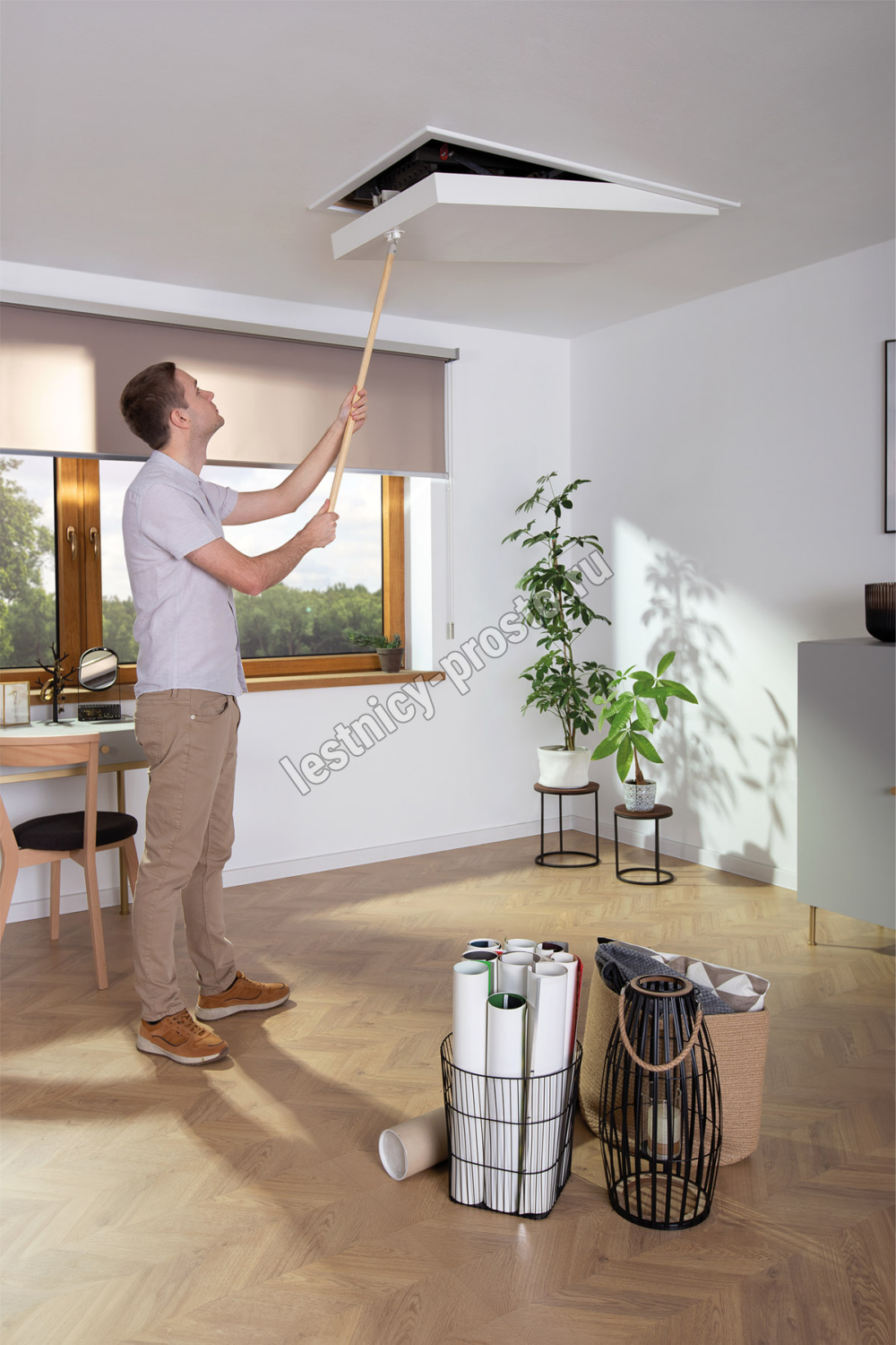 Супертеплоизоляционная лестница обладает повышенной теплоизоляцией и низкими показателями воздухопроницаемости крышки. Крышка люка выполнена из пенополистирола без применения дополнительных деревянных элементов. Новый профиль короба лестницы позволяет проще и быстрее установить декоративные планки.