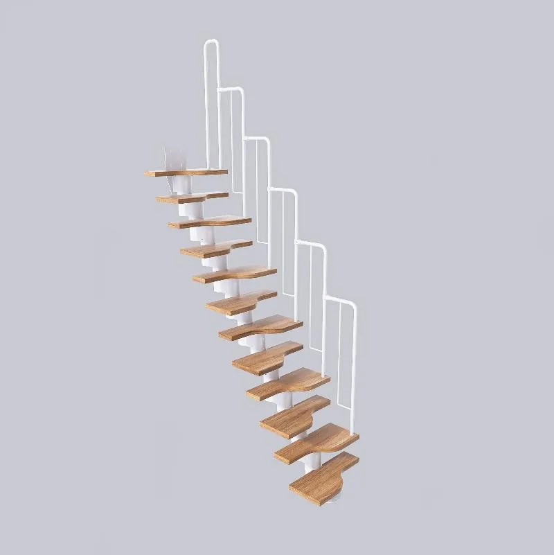 Компактная деревянная лестница с металлическими стойками перил. Легко собирается и занимает небольшое пространство на первом и втором этаже. Фиксированный квадратный короб на верхнем уровне обеспечивает дополнительную прочность конструкции. Монтаж осуществляется силами двух человек на объекте по указаниям, приведенным в паспорте на лестницу.