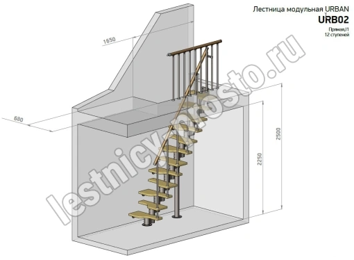 Лестница Prosto Urban Black гусиный шаг 700 мм с поручнем ПВХ, h234-336 см (13 ступеней), дуб