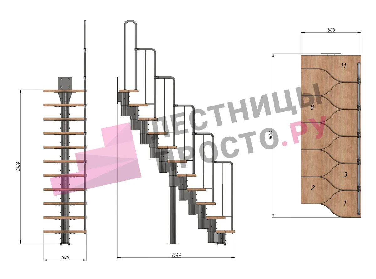 | Лестница Prosto Urban Black гусиный шаг 600 мм, h216-312 см (12 ступеней), бук |