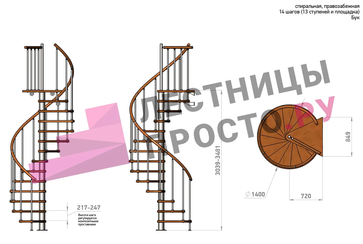 Решение о направлении поворота принимается при сборке лестницы - универсальная конструкция позволяет собрать правозабежную и левозабежную лестницы. Экономит пространство. Высота ступеней регулируется с шагом 3 мм. в пределах 217-247 мм., благодаря чему, лестница прекрасно подгоняется под необходимую высоту.