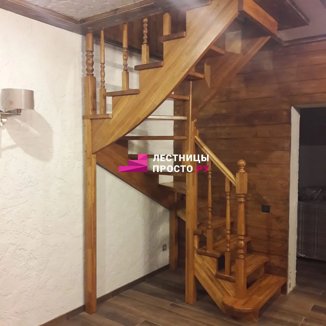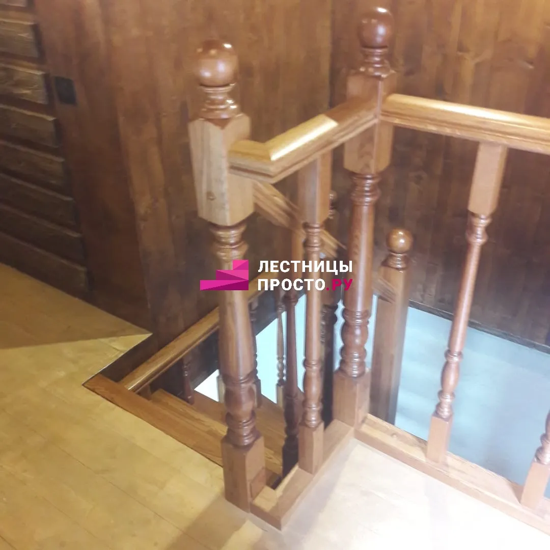 Лестница изготовлена из дуба паркетной склейки.
